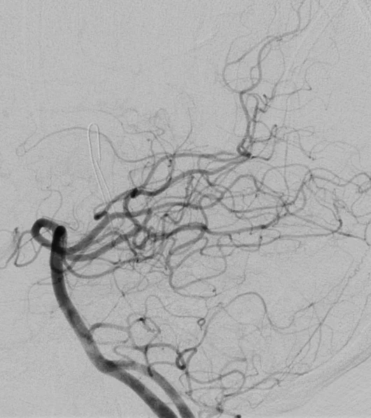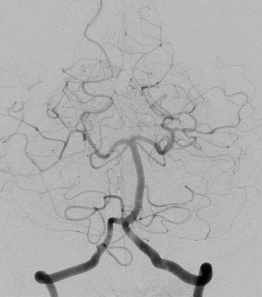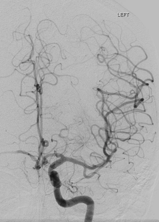 Cet examen invasif, réalisé sous anesthésie locale, permet d’obtenir une analyse morphologique et dynamique très précise des artères et des veines du cerveau ou de la moelle épinière en rendant les vaisseaux sanguins visibles aux rayons X en y injectant un produit de contraste à l’aide d’un tuyau (cathéter) que l’on navigue sous contrôle radiologique depuis le poignet ou le pli inguinal.